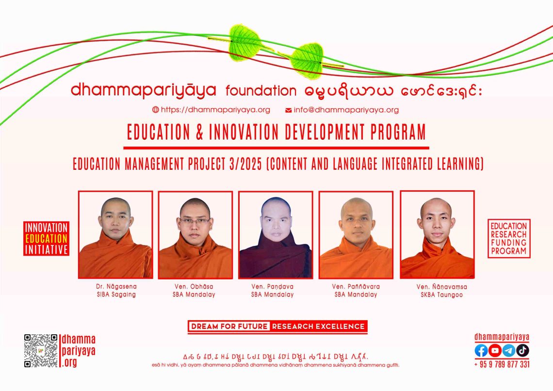 Education Management, Education Project, ERF, RID DPF EM 3/2025- Content and Language Integrated Learning October 26, 2025 Dhammapariyāya FoundationResearch & Innovation Development ProgramEducation Management Project (3/2025) ProgramCourseIntuitions – Research & InnovationDevelopment Program– Education & Research Funding ProgramFaculty Development: Content and Language Integrated LearningTraining: TEA – Teacher Education AcademySitagu International Buddhist Academy Sagaing – Mandalay – Ketumati More info @https://dhammapariyaya.org/edu-management/ Previous DPF Research Talk 2025/2 Newer DPF Education Management Project 2022-2025 You May Also Like DPF Research Grand Award 24/1 Recipient List August 12, 2024 DPF ERD Funding 2025/14 – SBAM ICT Development 25-26 July 4, 2025 DPF Research Talk 2025/01 August 27, 2025