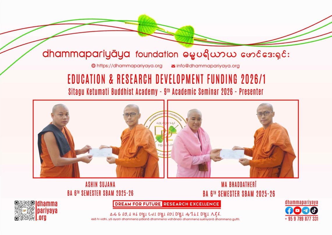 ERF, Funding DPF ERD Funding 2026/1 – SKBA 9th Academic Seminar – Presenter January 10, 2026 Dhammapariyāya FoundationEducation & Research Development Funding 2025/16 ProgramPurposeInstitution/IndividualEducation & Research Development FundingMyanmar Paper Presenter9th Academic Seminar Sitagu Ketumati Buddhist Academy 1-2 Jan 2026Ashin SujanaMa BhaddatherīBA 6th Semester SBAM 25-26 More info @https://dhammapariyaya.org/r-n-d-funding/https://dhammapariyaya.org/erf/ Previous DPF - Tibhāgabhojanavidhi - Culinary Tour You May Also Like DPF Research Grant Award 2025/1 November 12, 2025 DPF Research & Development Funding 2023/2 September 25, 2023 DPF Funding Program 2022 Open Now April 17, 2022