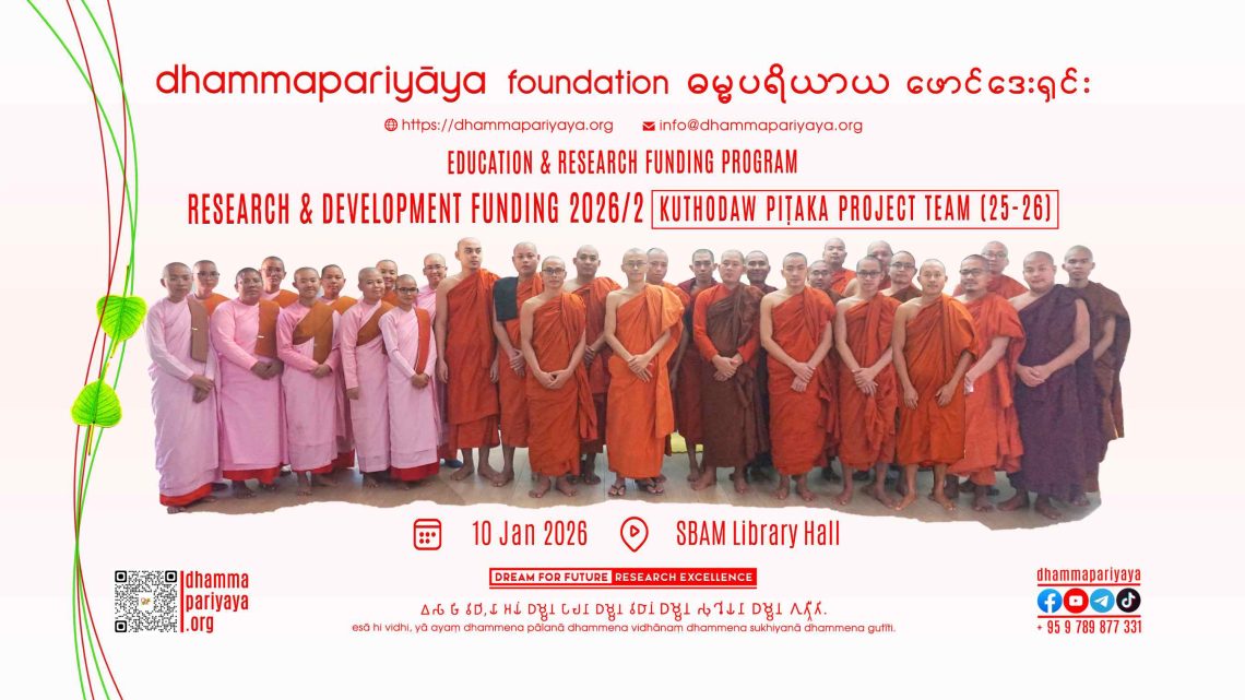 ERF, Funding, Program DPF ERD Funding 2026/2 – SBAM Kuthodaw Pitaka Project Team 25-26 January 23, 2026 Dhammapariyāya FoundationEducation & Research Development Funding 2026/2 ProgramPurposeInstitution/IndividualEducation & Research Development Funding Kuthodaw Piṭaka ProjectKuthodaw Piṭaka Project Team 2025-26Sitagu Buddhist Academy Mandalay More info @https://dhammapariyaya.org/r-n-d-funding/https://dhammapariyaya.org/erf/ Previous DPF - Paṇītāhāra - Tibhāgabhojanavidhi - Culinary Tour Newer DPF KPDL Online Access Supply - 2026 - IBSC You May Also Like Support for DPF Education and Research 2025 July 3, 2025 DPF KPDL Online Access Supply – KBRL YGN March 10, 2025 DPF KPDL Online Access Supply – CBU Yangon March 18, 2025