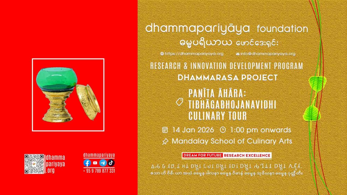 Dhammarasa Project, Tour DPF – Tibhāgabhojanavidhi – Culinary Tour January 9, 2026 Dhammapariyāya Foundation🍀Research and Innovation Development Program🔖Dhammarasa Project – Tibhāgabhojanavidhi Culinary Tour ProgramProjectTourResearch and Innovation Development ProgramDhammarasa Project 🔖Tibhāgabhojanavidhi Culinary Tour📅 14 Jan 2025⏰ 1:00 pm onwards📍Mandalay School of Culinary Arts More info @ https://dhammapariyaya.org/dhammarasa-project/ Previous DPF KPDL Online Access Supply – 2026 - DU DBS Newer DPF ERD Funding 2026/1 – SKBA 9th Academic Seminar - Presenter You May Also Like Dhammapariyāya Research Fellowship October 31, 2021 DPF Learning Management System Project August 18, 2024 DPF KPDL Online Access Supply – UCL Yangon March 21, 2025