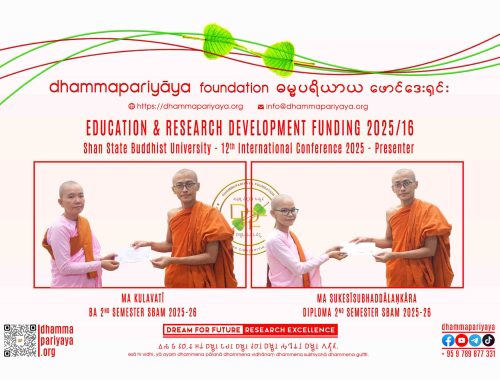 Dhammapariyāya FoundationEducation & Research Development Funding 2025/16 Program Purpose Institution/Individual Education & Research Funding Pāḷi Paper Presenter12th International ConferenceShan State Buddhist University Ma Kulavatī BA 2nd Semester Ma SukesīsubhaddālaṅkāraDiploma 2nd Semester SBAM 25-26 More info @ https://dhammapariyaya.org/r-n-d-funding/https://dhammapariyaya.org/erf/