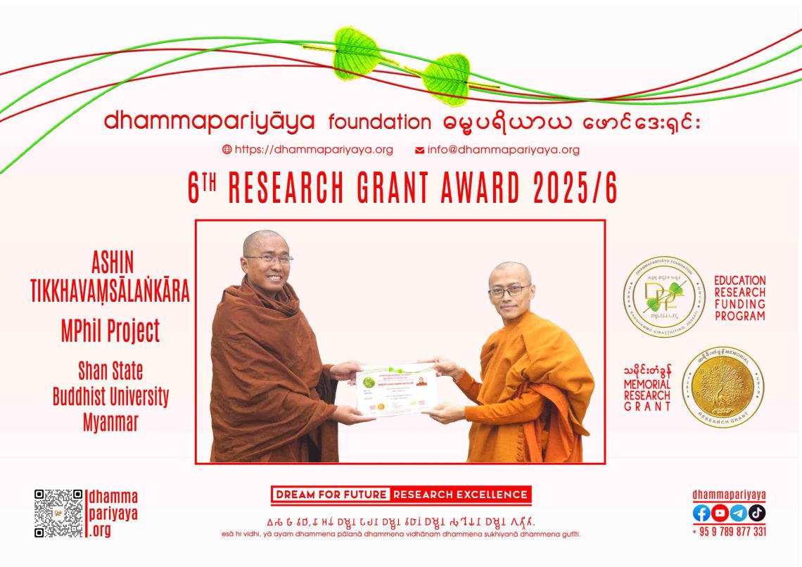 November 8, 2025Dhammapariyāya Foundation6th Research Grant 2025/6 Program Purpose Institution/Individual – Education & Research Funding– သမိုင်းတံခွန်Memorial Research Grant 6th Research Grant Ashin TikkhavaṃsālaṅkāraMPhil ResearchShan State Buddhist Univesity More info @ https://dhammapariyaya.org/research-grant/ https://dhammapariyaya.org/erf/ https://dhammapariyaya.org/sponsor/