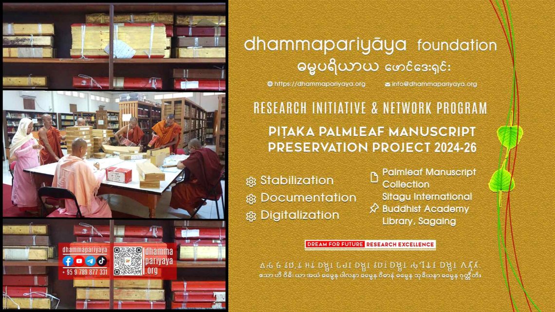 Preservation Project, Program, Project, RIN DPF Piṭaka Palmleaf Preservation Project 2026-01/1.0 December 22, 2025 Dhammapariyāya Foundation🍀Research Initiative and Network Program🔖Piṭaka Palm-Leaf Manuscript Preservation Project 2024-26 – Phase 1 ProgramProjectProject OutlineResearch Initiative and Network ProgramPiṭaka Palm-Leaf Manuscript Preservation Project1)Stabilization2)Documentation3)Digitalization Project VolunteersScheduleProject SiteMA Research StudentsSitagu Buddhist AcademyMandalayPhase 1Section 111 Dec 2025Piṭaka Palm-leaf Manuscript CollectionSitagu International Buddhist Academy Library Sagaing More info @https://dhammapariyaya.org/preservation-project/ Previous DPF Piṭaka Palmleaf Preservation Project 2026 Newer DPF KPDL Online Access Supply – UGP 2025 You May Also Like DPF ERD Funding 2025/15 – SKBA 2nd Research Seminar – Presenter August 7, 2025 DPF ERD Funding 2025/10 – Pāḷi Talk Speakers May 15, 2025 DPF Library Restoration & Reconstruction Supply 2025/3 April 27, 2025