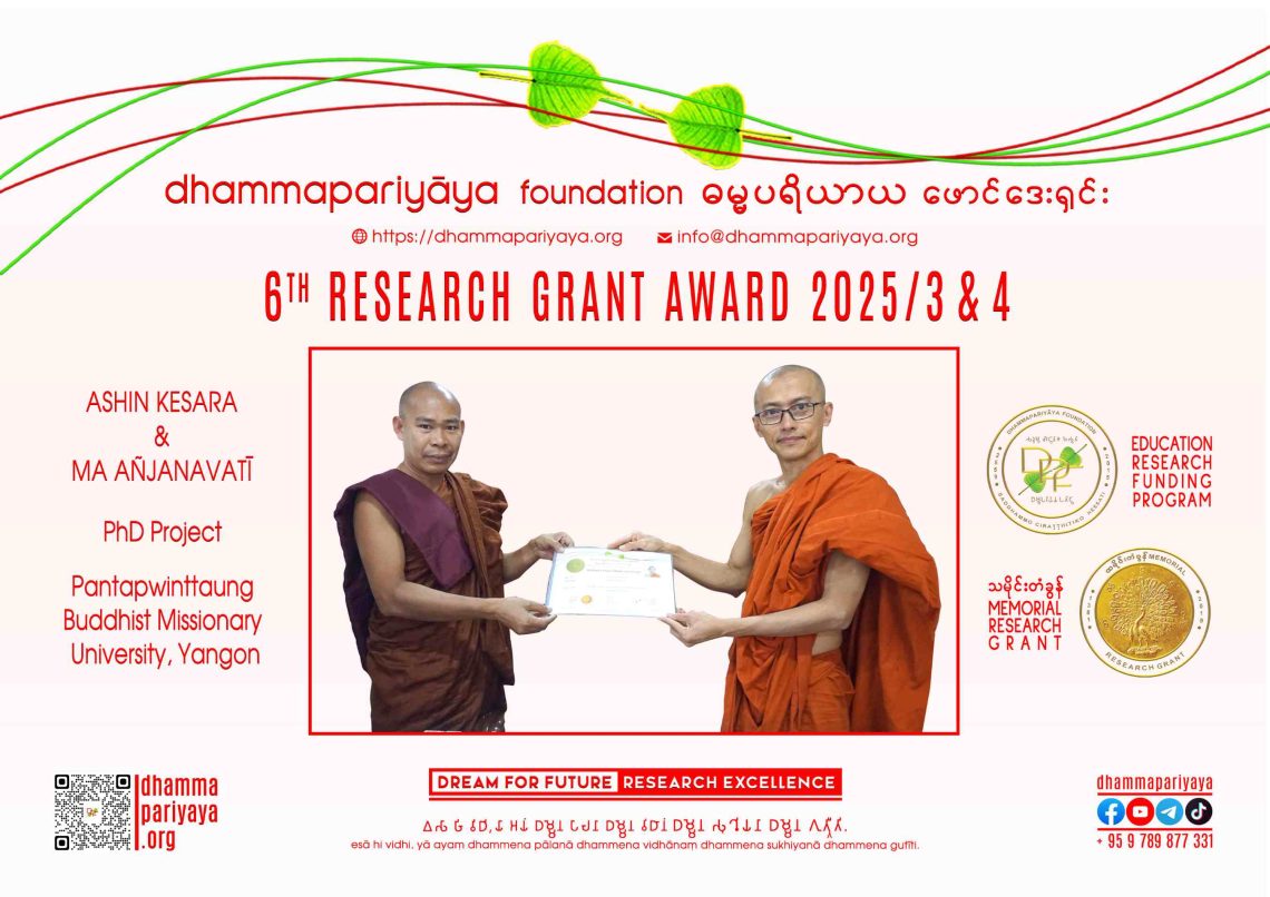 Award, ERF, Program, Research Grant DPF Research Grant Award 2025/3&4 December 5, 2025 Dhammapariyāya Foundation6th Research Grant 2025/3&4 NoProgramPurposeInstitution/Individual3– Education & Research Funding– သမိုင်းတံခွန်Memorial Research Grant6th Research GrantAshin KesaraPhD ProjectPantapwinttaung Buddhist Missionary University, Yangon4– Education & Research Funding– သမိုင်းတံခွန်Memorial Research Grant6th Research GrantMa AñjanavatīPhD ProjectPantapwinttaung Buddhist Missionary University, Yangon More info @https://dhammapariyaya.org/research-grant/https://dhammapariyaya.org/erf/https://dhammapariyaya.org/sponsor/ Previous DPF Language Talk 2025 You May Also Like DPF Research Grant Award 2019 July 12, 2023 DPF Research & Development Funding 2024/1 January 6, 2024 DPF 2024 Annual Report May 5, 2025