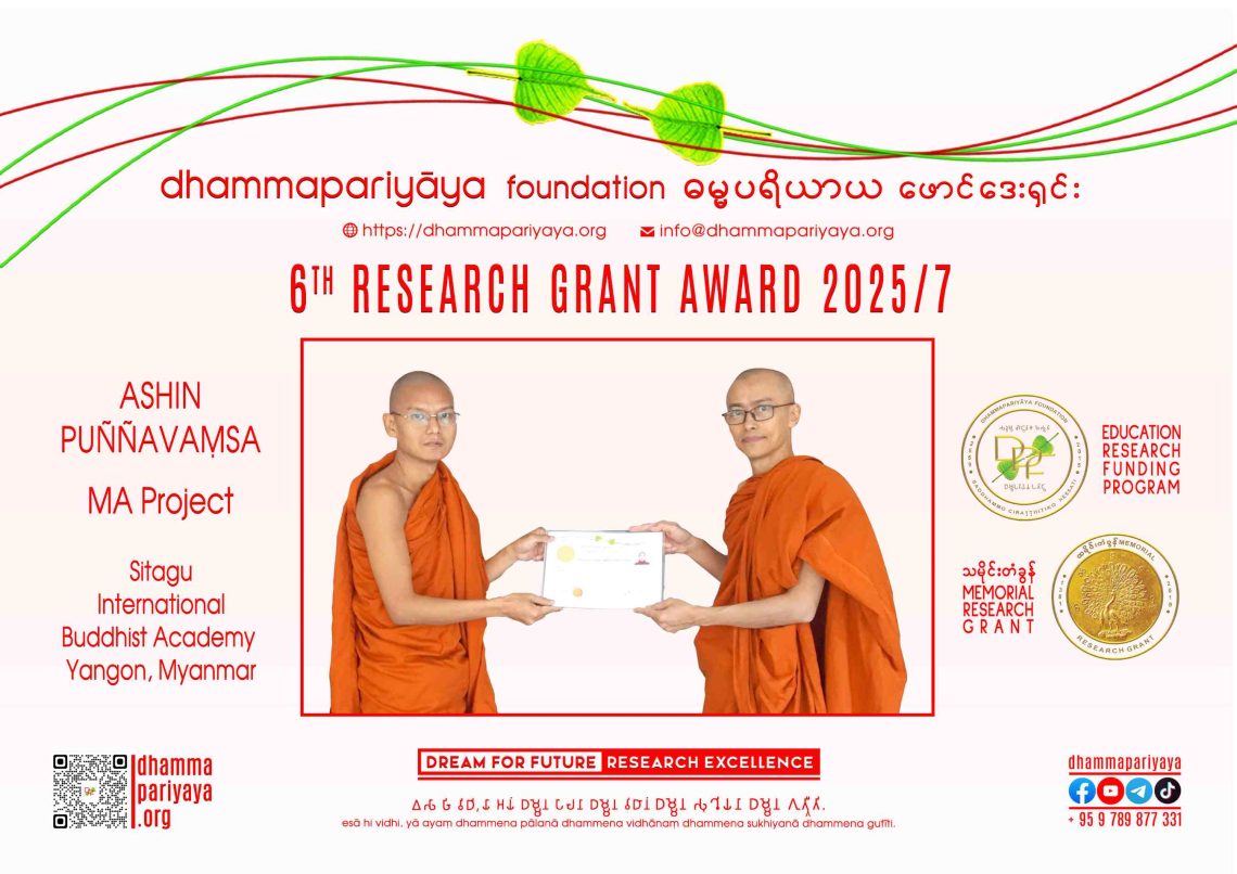 Award, ERF, Program, Research Grant DPF Research Grant Award 2025/7 November 30, 2025 Dhammapariyāya Foundation6th Research Grant 2025/7 ProgramPurposeInstitution/Individual– Education & Research Funding– သမိုင်းတံခွန်Memorial Research Grant6th Research GrantAshin PuññavaṃsaMA ProjectSitagu International Buddhist Academy Yangon More info @https://dhammapariyaya.org/research-grant/https://dhammapariyaya.org/erf/https://dhammapariyaya.org/sponsor/ Previous DPF Edu Talk 2025/02 Newer DPF Research Grant Award 2025/8 You May Also Like DPF Greet & Meet – 6th Research Grant Award 2025 August 19, 2025 DPF KPDL Online Access Supply – SPSU YGN January 15, 2025 Dhammapariyāya Strategic Vision October 24, 2021